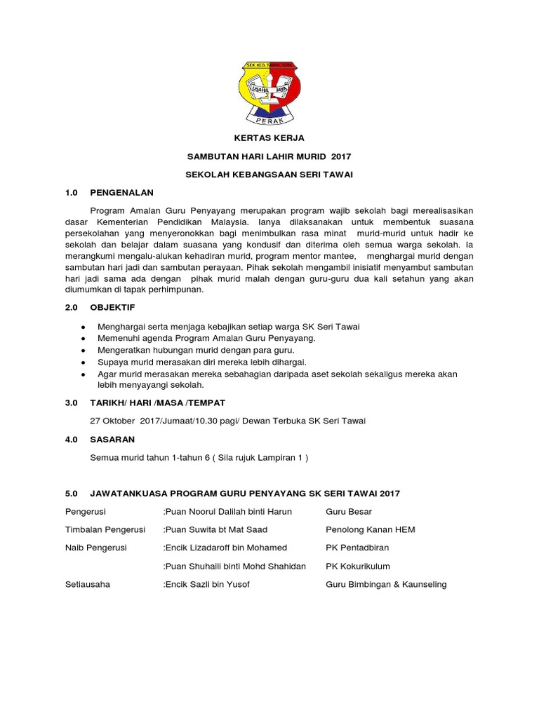 Kertas Kerja Sambutan Hari Lahir Murid Pdf